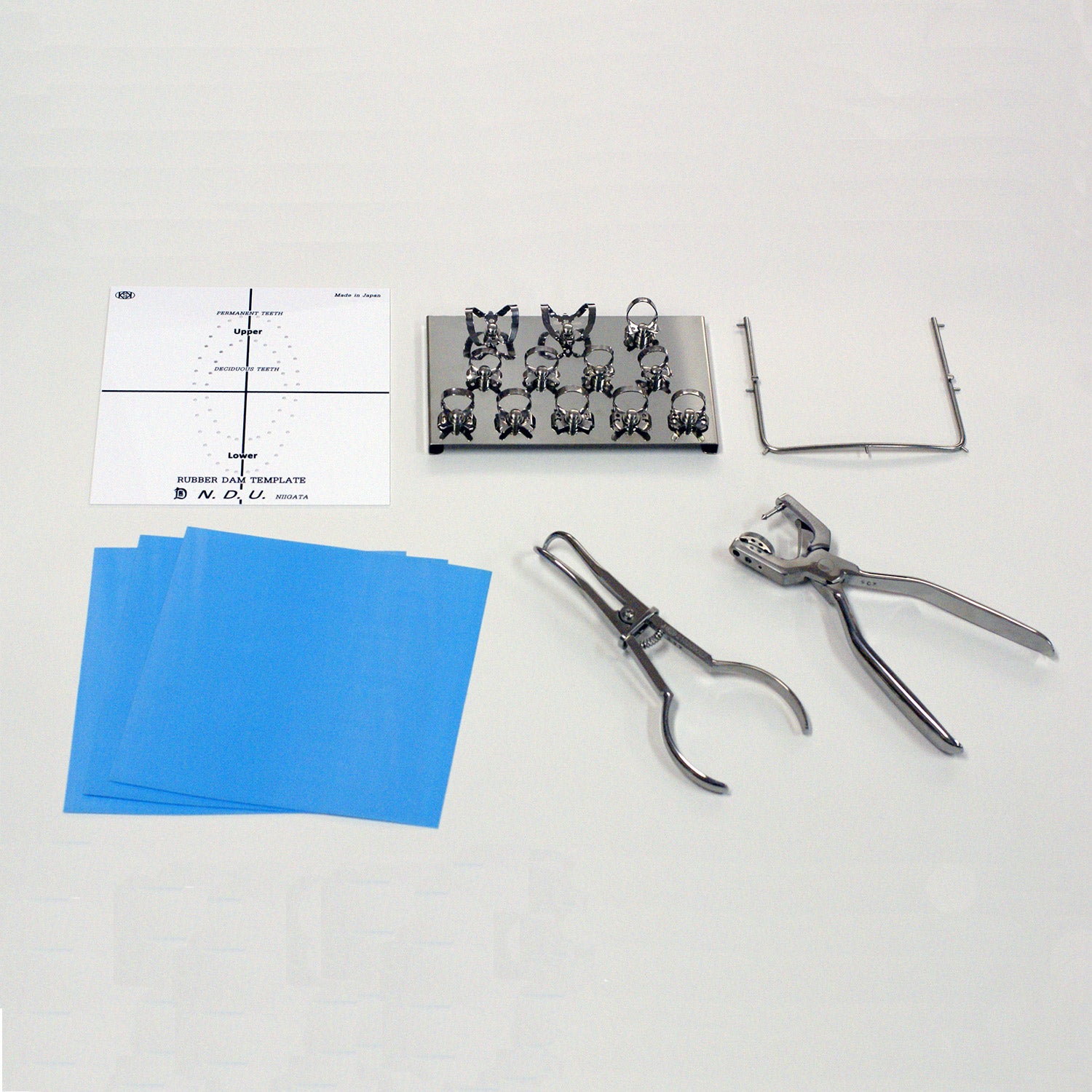 | Specification | ・Clamp board #12 (types: #210, 9, 0, 2, 2A, 206, 207, 5, 56, 7, 201, 202) ・Young frame (for adults) ・Rubber dam punch ・KSK clamp forceps ・KSK dental dam non-latex (1 bag) ・Rubber dam template |